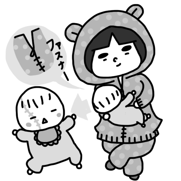 ブラックジャック Posted on 2014年2月19日 by yoshiwo 熊の耳のついた部屋着がある。 センターは、ファスナーで開けるタイプ。 この服で授乳してると、娘が・・・ 必死にしがみついて、乳を飲んだ結果、ファスナーの跡が顔についてブラックジャックみたいになってる。 そんな姿も、かわいいけどね!