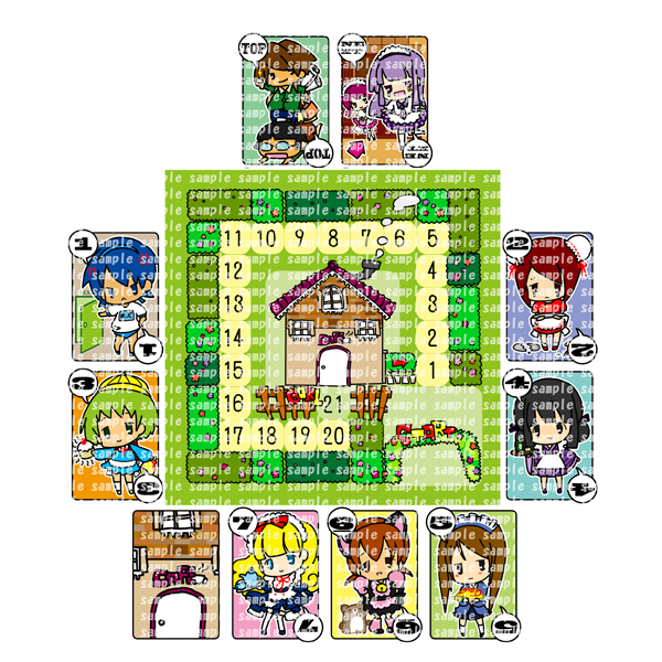 極上メイドに会えるその日まで、通い続ける男達の戦い!!時には慎重に、時には大胆に、サイコロを振ってメイド喫茶を目指せ!高得点の極上メイドは1枚だけ!ライバルの上に乗って横取りだ!一発逆転のへたれメイドも?