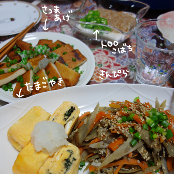 ご飯を「麦ごはん」にしたのでトロロ小鉢を用意。卵焼きにはシソをIN。さつま揚げは旦那サマの好物です。